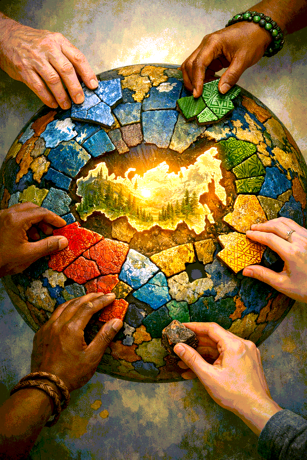 Плакат о принципах независимости, равенства и дружбы народов. Образ собираемой мозаики планеты Земля символизирует многообразие культур и цивилизаций. Россия в центре, как связующий элемент сотрудничества и дружбы, основанный на взаимоуважении. Работа подчёркивает идею «мягкой силы» как диалога культур и совместного созидания будущего.