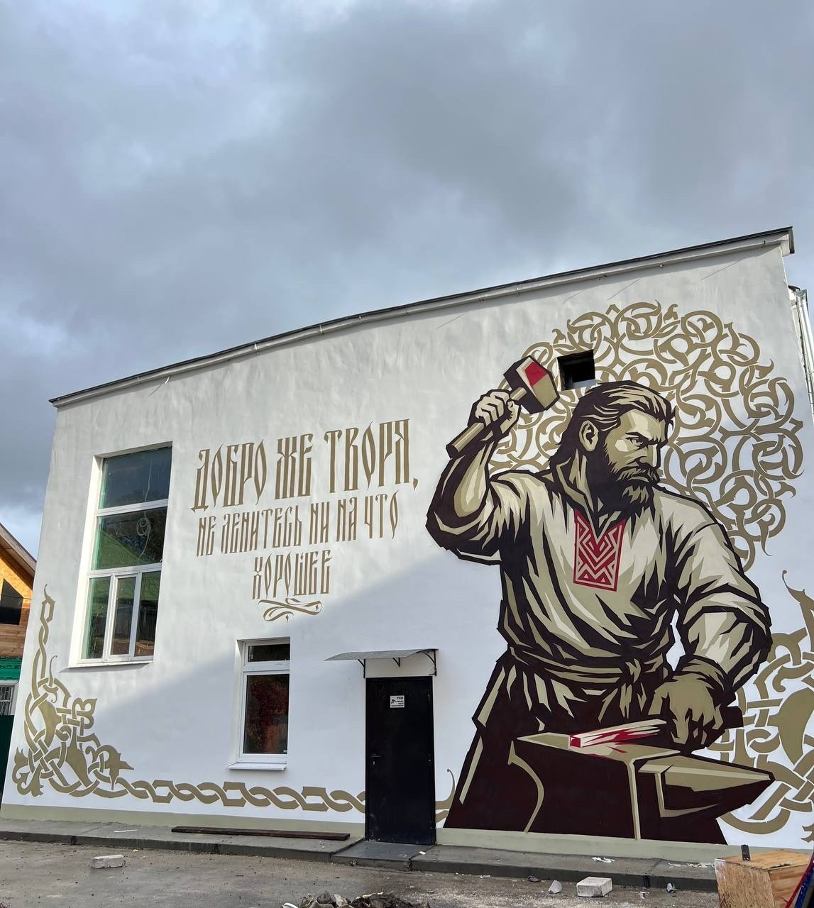 Плакат - мурал с образом могучего кузнеца воспевает созидательный и честный мирный труд. В каллиграфии – первые слова из «Поучения» Владимира Мономаха призывают к усердию и созиданию добрых дел без лени.